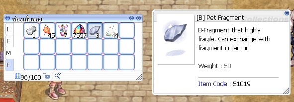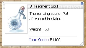However, if the combination fails, you will receive an item called [B] Fragment Soul instead. Double-clicking on this item will give you a random pet egg back in the same grade as the one you tried to combine (in this case, grade C), plus 1 Pet Fragment or a piece of a pet in a higher tier.